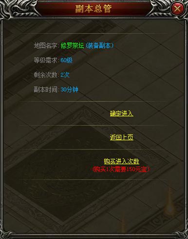单人装备副本,爆率超高,根据自身等级,可以挑战不同等级的副本,每个装备副本地图每天都可进入一次,清完地图内怪物后可在右边导航栏处领取奖励。